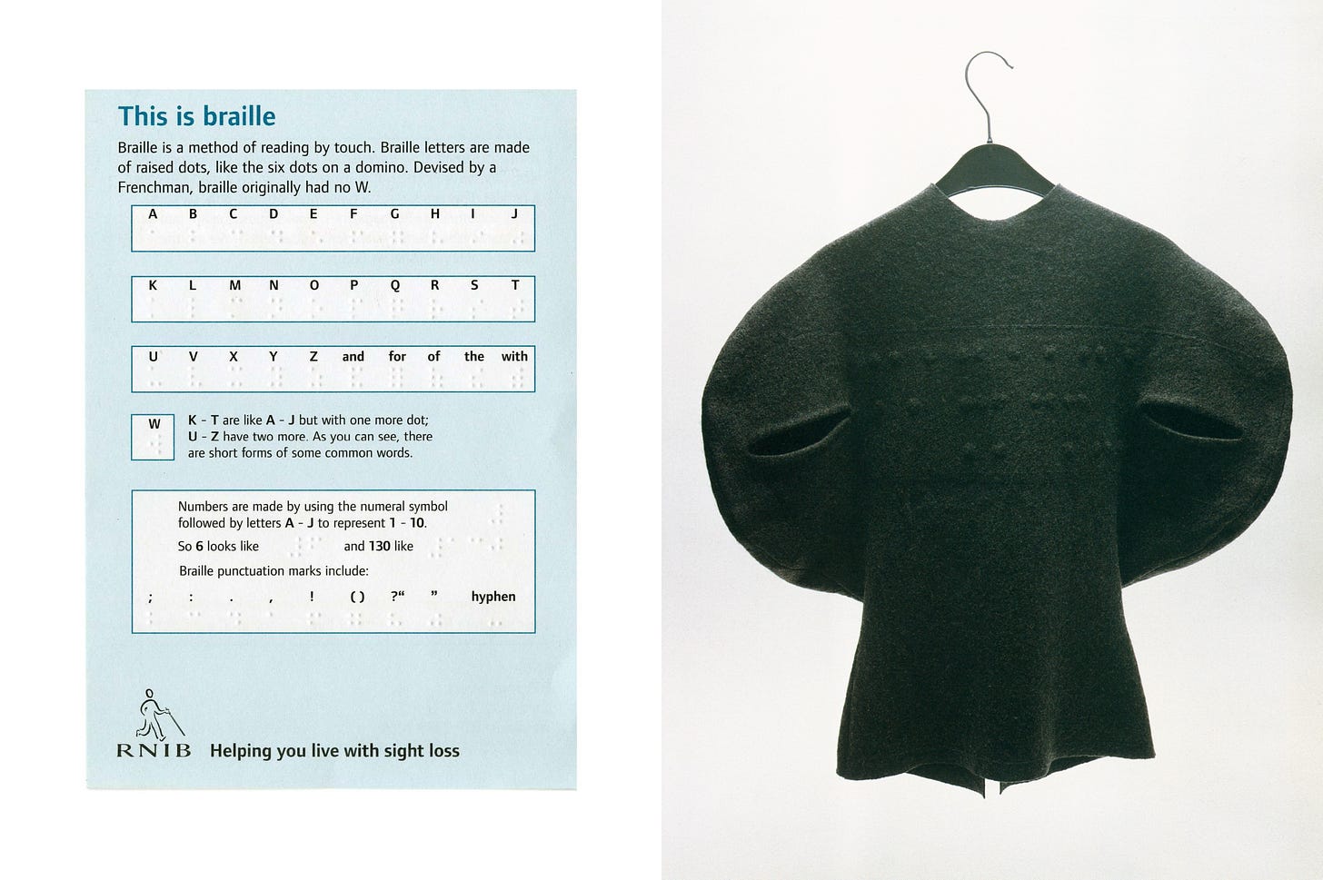 Back in 1998, when I was teaching at a college in Marylebone, during one of my lunchbreaks, I stumbled across the Royal National Institute of Blind People shop. Without any real reason to be in there, I got talking to the staff, enquiring about all these obscure objects, such as an A4 frame with lines across it. When I was told it enabled blind people to line a piece of paper straight, I was wowed. The thought of this basic thing we manage, simply because we can see. I then started to look into Braille and how I could emboss it into clothing. It became the baseline of collection #5. Never for the purpose of solving a problem. More because I liked the concept of this conversation around Braille being used in clothing. This then led on to other things, like Morse code. That started with a visit to Bletchley Park, an estate north of London, which became the principal centre for coding during World War II. Again, this human aspect drew me in.